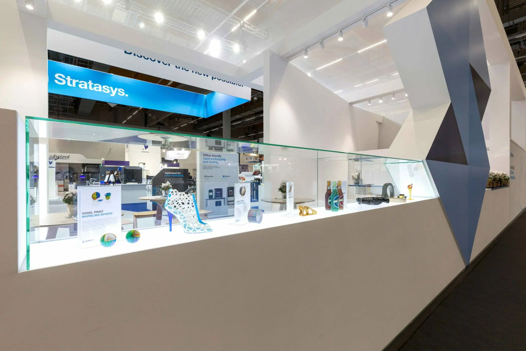 Stratasys is a global leader in additive technology solutions for industries including Aerospace, Automotive, Healthcare, Consumer Products and Education. Inspired by the logo’s dominant shape, Stratasys’ booth design at Formnext exhibition invites visitors to an exploring “journey”, beginning with display and demo areas, conveying Stratasys’s unique expertise and know-how followed by an impressive welcoming hospitality space, for industry acquaintance and further business purposes.