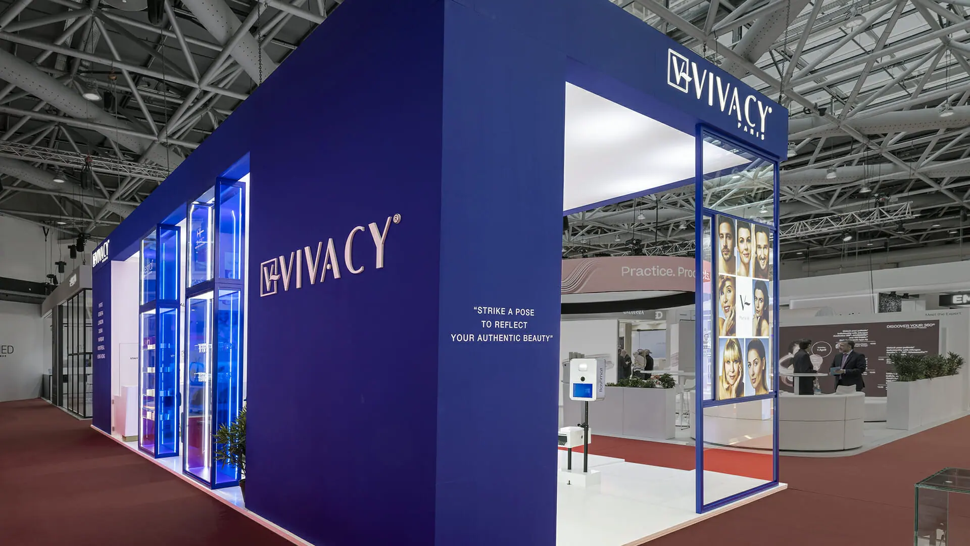 Laboratories Vivacy is a French manufacturer, specializing in design, production and distribution of high quality injectable medical devices for use in the field of Anti-Aging, in Medical Aesthetics and Visco supplementation. Laboratories Vivacy were going for a new, modern and fresh look. The booth was elegant, classy, modern and yet with a touch of a “techy” feel, to convey their innovative medical technology expertise